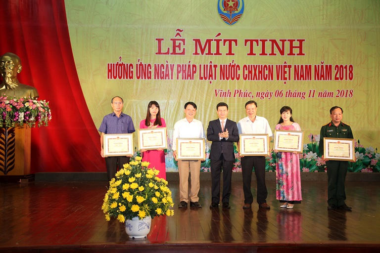 Phối hợp với các Sở, ngành, UBND cấp huyện tổ chức mở 292 lớp bồi dưỡng kiến thức pháp luật cho cán bộ và nhân dân ở cơ sở, số người tham dự là: 43.810 người. Ngoài ra, Sở Tư pháp phối hợp với Báo Vĩnh Phúc và Tỉnh đoàn thanh niên tổ chức thành công 02 cuộc thi tìm hiểu pháp luật: Cuộc thi trực tuyến “Tìm hiểu Bộ luật hình sự năm 2015”, với sự tham gia của 5.380 lượt thi thí sinh tham gia dự thi và cuộc thi sân khấu “Kể chuyện theo án”. Phối hợp với Đài PTTH tỉnh, Báo Vĩnh Phúc xây dựng trên 100 chuyên mục phổ biến, giáo dục pháp luật “giới thiệu văn bản pháp luật”, “hỏi đáp pháp luật” , “pháp luật và đời sống’’, “cửa sổ Tư pháp”phản ánh thực trạng thực hiện pháp luật ở địa phương, giải đáp, giới thiệu văn bản mới của Trung ương, của tỉnh; in và cấp phát 314.200 tài liệu tuyên truyền PBGDPL; giúp UBND tỉnh tổ chức Lễ mít-tinh hưởng ứng Ngày pháp luật năm 2018 và khen thưởng cho các tập thể, cá nhân có thành tích xuất sắc trong 5 năm triển khai Ngày Pháp luật.