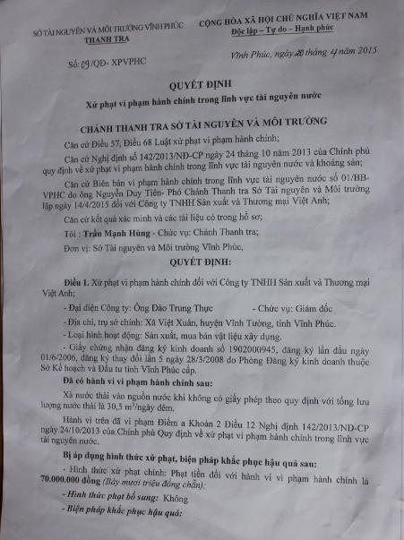 Ngay sau khi nhận được thông tin phản ánh về vụ việc, ngày 15/01/2015, Giám đốc Sở TNMT tỉnh Vĩnh Phúc đã ra quyết định thanh tra việc chấp hành pháp luật đất đai, bảo vệ môi trường và tài nguyên nước đối với Công ty Việt Anh.