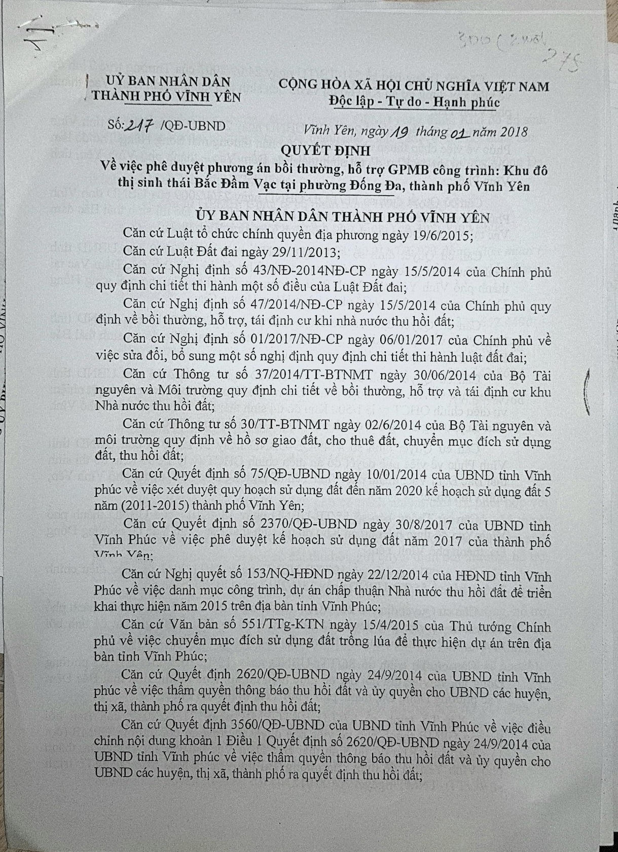 Qua tìm hiểu của PV, UBND thành phố Vĩnh Yên đã ban hành các quyết định phê duyệt phương án bồi thường, hỗ trợ giải phóng mặt bằng công trình: Khu đô thị sinh thái Bắc Đầm Vạc tại phường Đống Đa, thành phố Vĩnh Yên với tổng kinh phí hơn tỷ 64,6 tỷ đồng. Bao gồm các nội dung: Bồi thường, hỗ trợ đất nông nghiệp; bồi thường, hỗ trợ tài sản, vật kiến trúc, cây trông; chi phí lập, thẩm định phương án bồi thường.