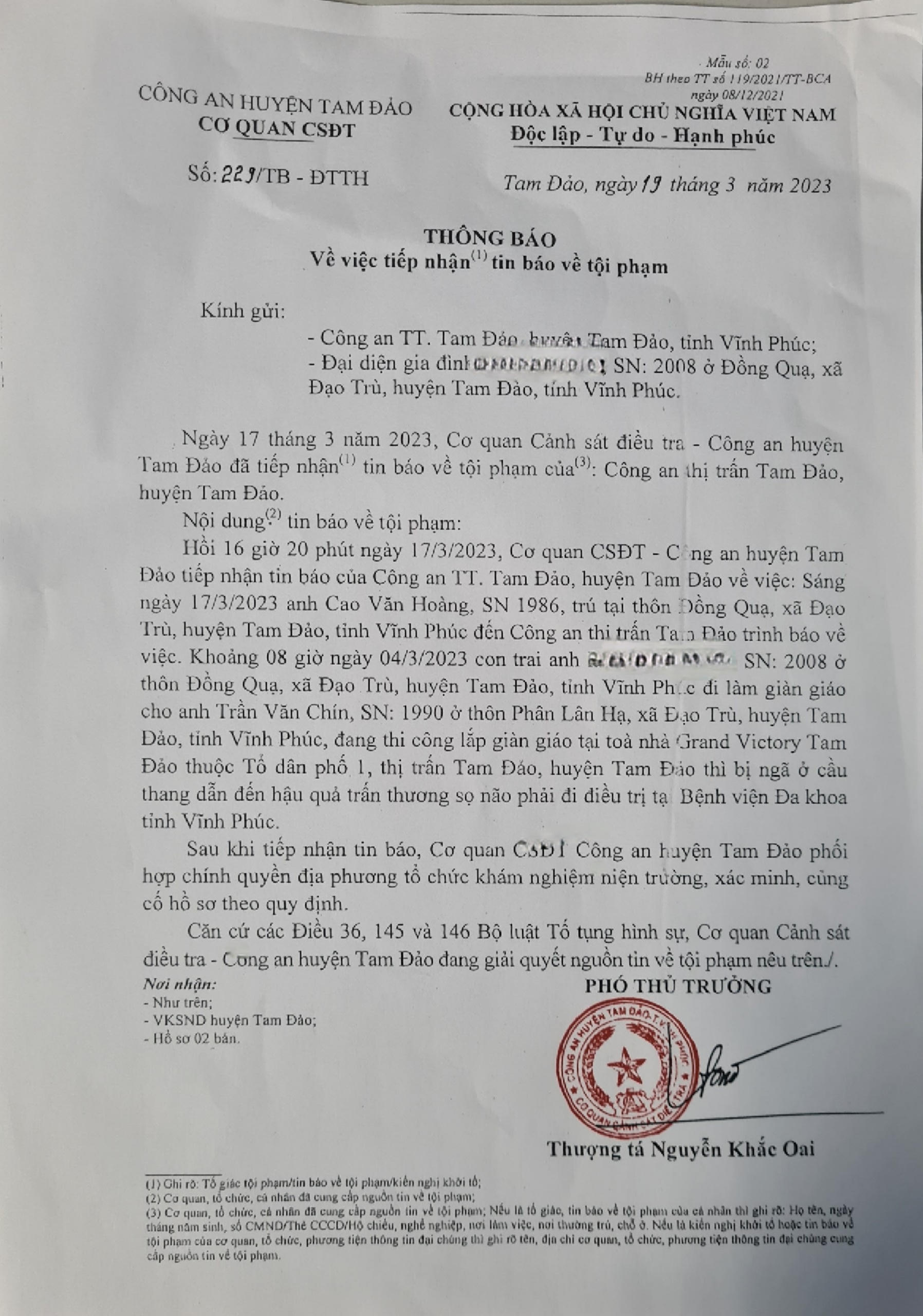 Thông báo tiếp nhận tin báo về tội phạm của Cơ quan Cảnh sát điều tra huyện Tam Đảo. |