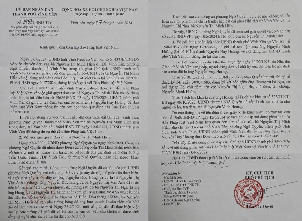 Về nội dung phản ánh việc UBND TP Vĩnh Yên tại Văn bản số 1968/UBND-TP ngày 12/6/2024 ghi sai tên đệm của ông Nguyễn Minh Hoàng (bố bà Hiền) thành Nguyễn Huy Hoàng, theo UBND TP Vĩnh Yên, tại Đơn xin ở nhờ đất Nhà thờ, được lập ngày 13/02/1995, do Nhà thờ Giáo xứ Vĩnh Yên cung cấp, người đứng đơn và chữ ký của đại diện hộ gia đình xin ở nhờ đất là ông Nguyễn Huy Hoàng. Theo Sổ đăng ký kết hôn do UBND phường Ngô Quyền lưu trữ, thì tại số đăng ký 34, ngày 30/03/1983, có nội dung: Họ, chữ đệm, tên vợ: Nguyễn Thị Nga; Họ, chữ đệm, tên chồng: Nguyễn Mạnh Hoàng. Theo Trích lục khai tử số 325/TLKT- BS ngày 09/10/2023, UBND phường Ngô Quyền đã cấp Trích lục khai tử cho người có họ, tên đệm, tên là: Nguyễn Minh Hoàng.