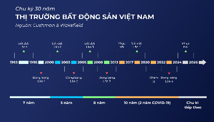 Kể từ khi Luật Đất đai năm 1993 ra đời, thị trường BĐS Việt Nam đã trải qua nhiều chu kỳ tăng trưởng xen kẽ với trầm lắng. Các chu kỳ này, với giai đoạn phát triển tốt luôn chiếm tỷ lệ áp đảo, đều gắn với các biến động kinh tế vĩ mô, đầu tư công cho hạ tầng và các bước ngoặt về chính sách. Trong đó, năm 2024 được nhận định là “vạch xuất phát” của một chu kỳ tăng trưởng mới.