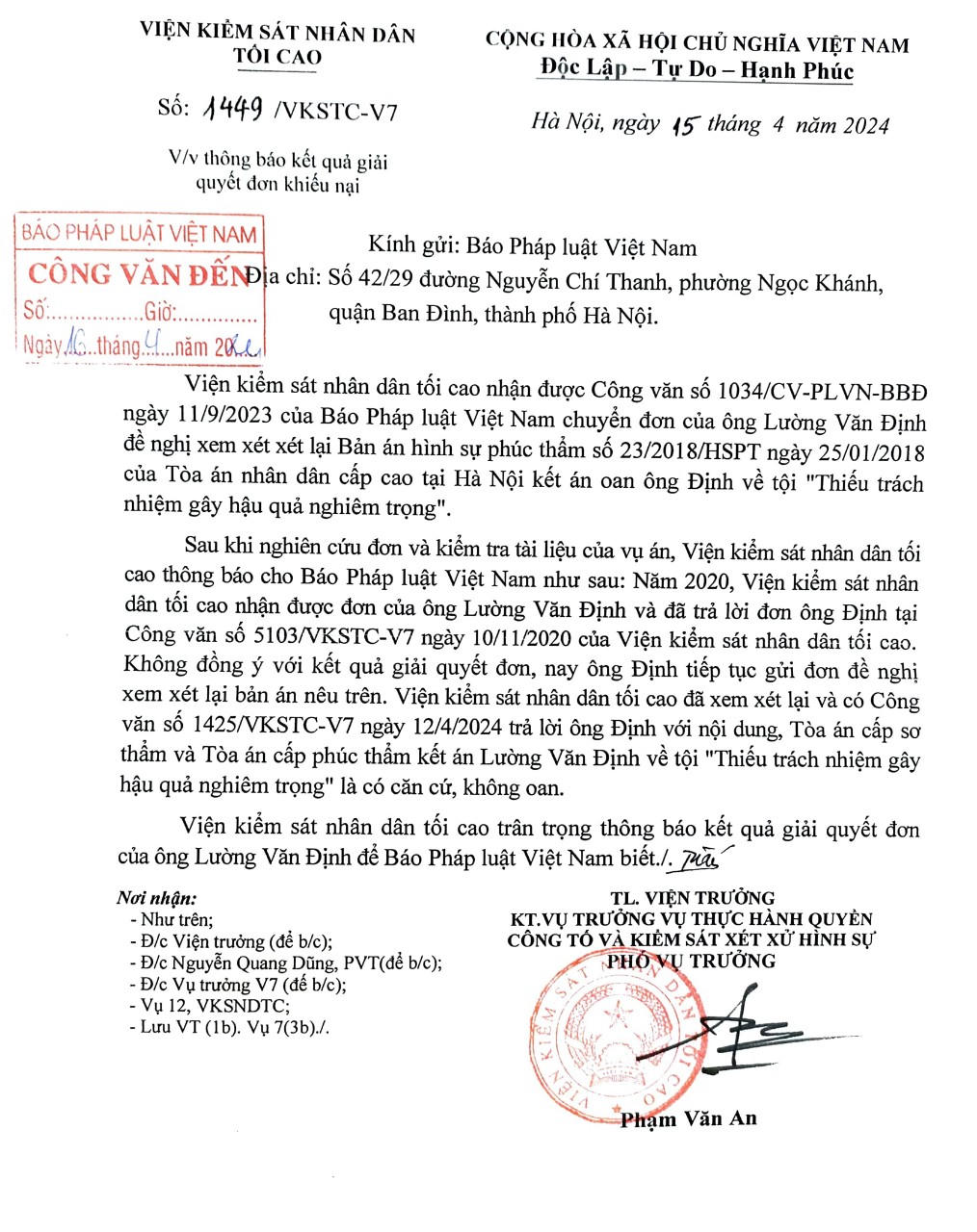 Ngày 15/4/2024, VKSND tối cao có Văn bản 1449/VKSTC-V7 gửi Báo PLVN thông báo kết quả giải quyết khiếu nại của ông Định. Văn bản nêu, năm 2020, VKSND tối cao từng nhận được đơn của ông Định và đã trả lời đơn ông Định tại Công văn 5103/VKSTC-V7 ngày 10/11/2020.