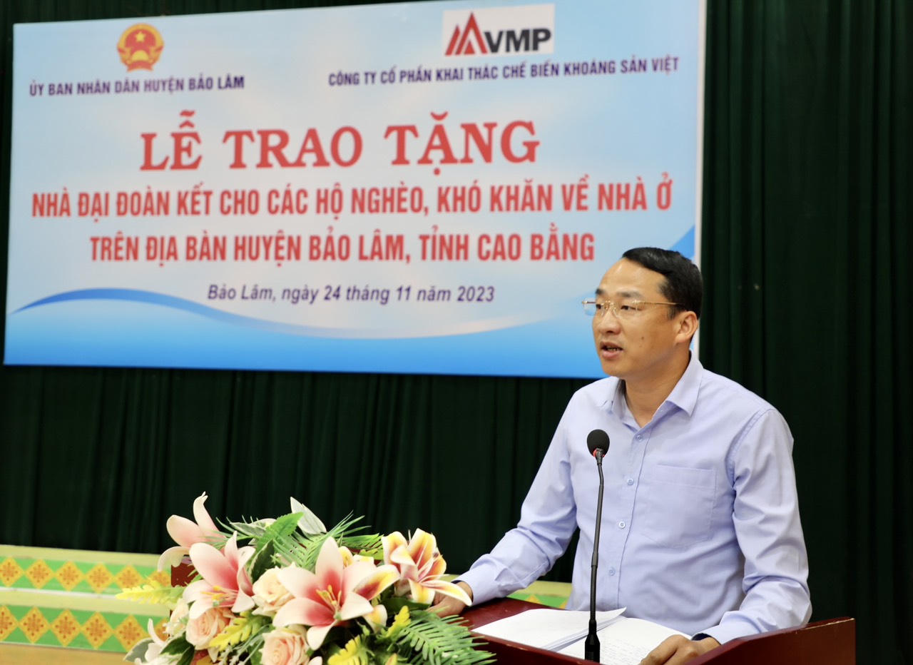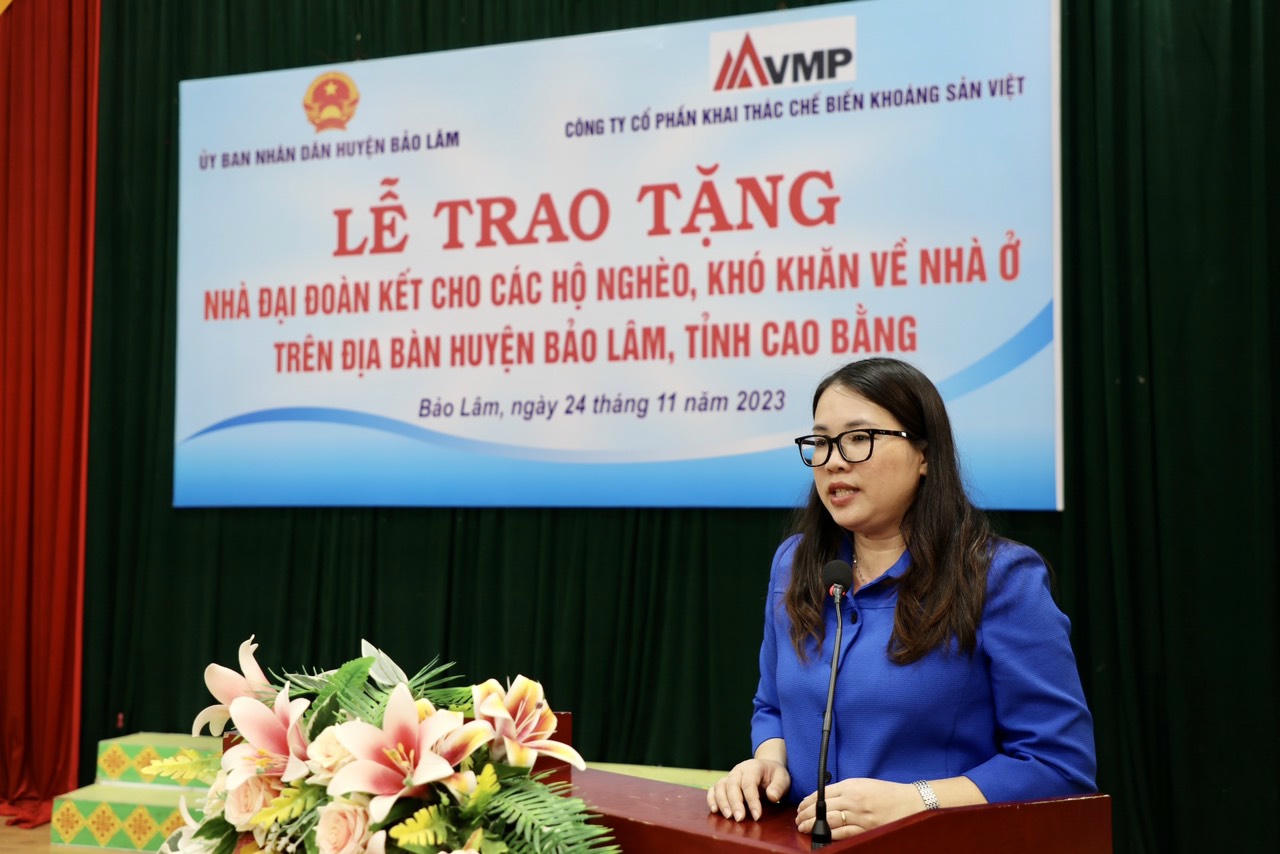 "Với mong muốn chung tay cùng chính quyền địa phương thực hiện chương trình giảm nghèo nhanh, bền vững gắn với phát triển nông thôn mới, Công ty cổ phần Khai thác chế biến Khoáng sản Việt có mặt ở đây ngày hôm nay để bàn giao và trao tài trợ nguồn kinh phí 2,2 tỷ đồng xây dựng 50 căn nhà đại đoàn kết cho các hộ nghèo tại địa phương.