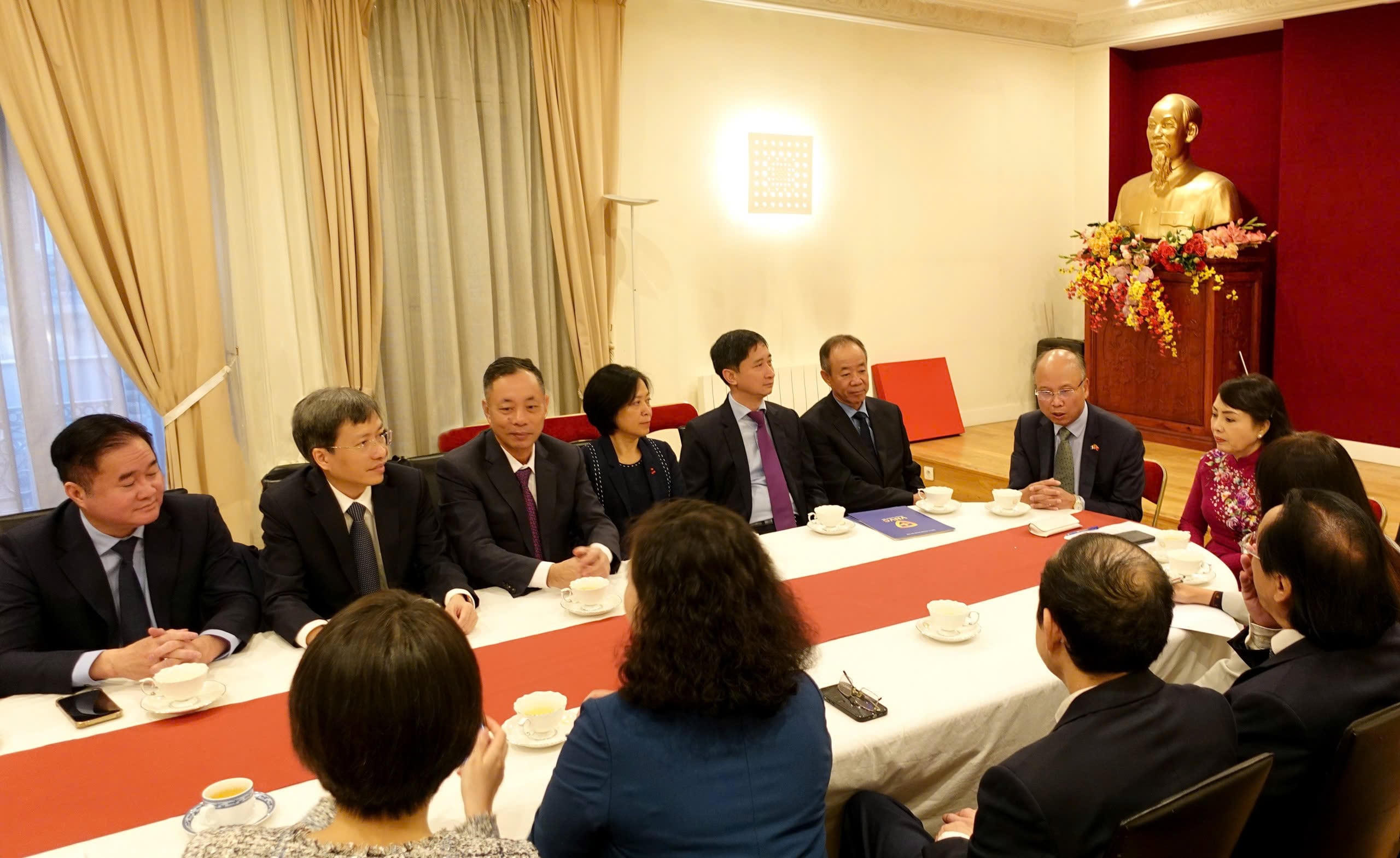 Ông Đinh Toàn Thắng gặp mặt PGS.TS Nguyễn Thị Kim Tiến cùng lãnh đạo Hội hữu nghị Việt-Pháp, Bộ Y tế, VNVC tại Đại sứ quán Việt Nam tại Pháp trước lễ ký kết. |
