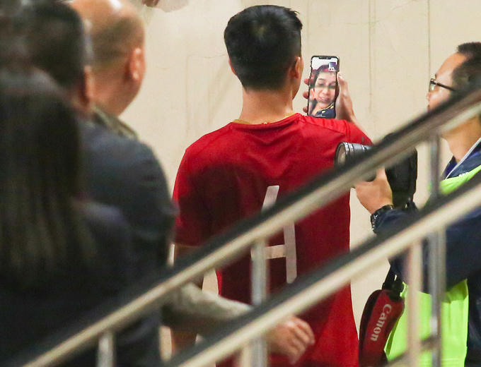 Bùi Tiến Dũng gọi điện cho vợ sau trận đấu với Thái Lan. Ảnh: Đương Phạm. |
