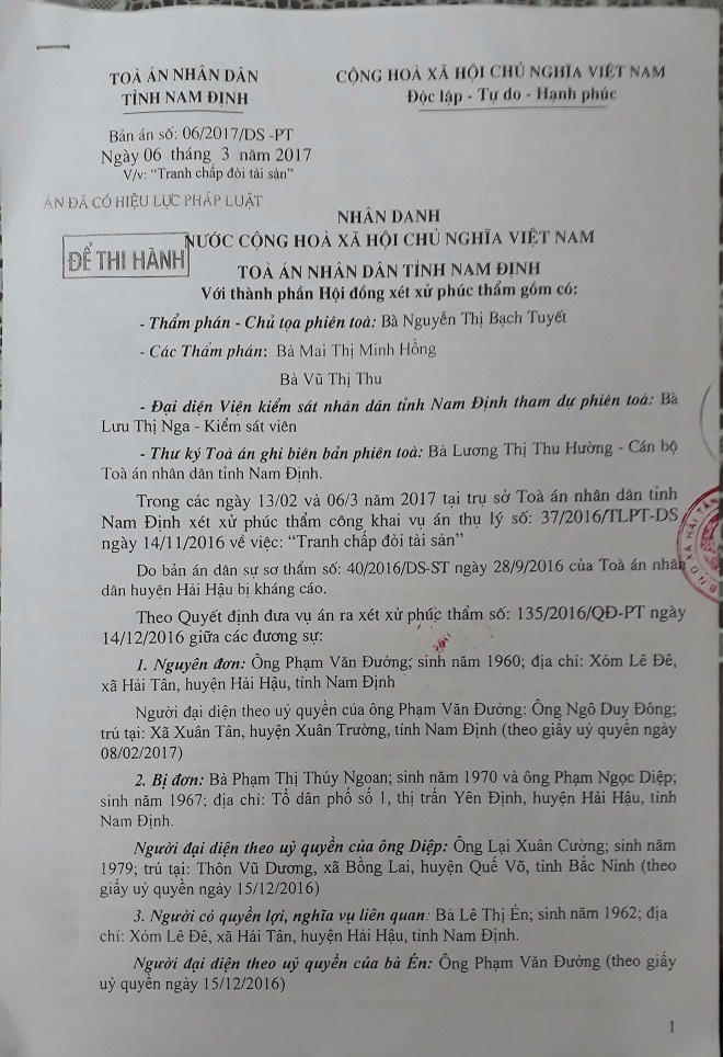 Cho vay số tiền lớn, đòi dai dẳng năm này qua năm khác nhưng vợ chồng ông Diệp vẫn không chịu trả, cực chẳng đã, năm 2017, bà Duyên, bà Lái và ông Đưởng làm đơn khởi kiện vợ chồng ông Diệp ra Tòa án nhân dân huyện Hải Hậu đòi số nợ trên.