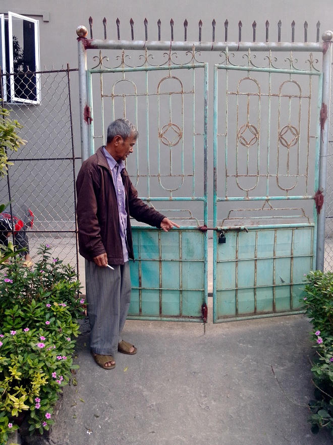 Chỉ vào chiếc cổng sắt xiêu vẹo do bị đứa cháu đập phá, ông Thục kể: “Mấy hôm trước nó lại vừa đến quấy phá gia đình tôi. Cửa khóa, không vào được bên trong, nó đứng ngoài đạp cổng đến nỗi chiếc cổng giờ siêu vẹo không mở ra được nữa. Mỗi lần muốn ra ngoài vợ chồng tôi lại phải đi nhờ qua nhà hàng xóm. Cống thoát nước bên ngoài cũng bị nó lấp lại, khiến mỗi lúc trời mưa sân nhà tôi lại như một biển nước. Vợ chồng già, con cái thì không có, những lúc như vậy chỉ biết nhìn nhau khóc”, ông Thục lau vội những giọt nước mắt.