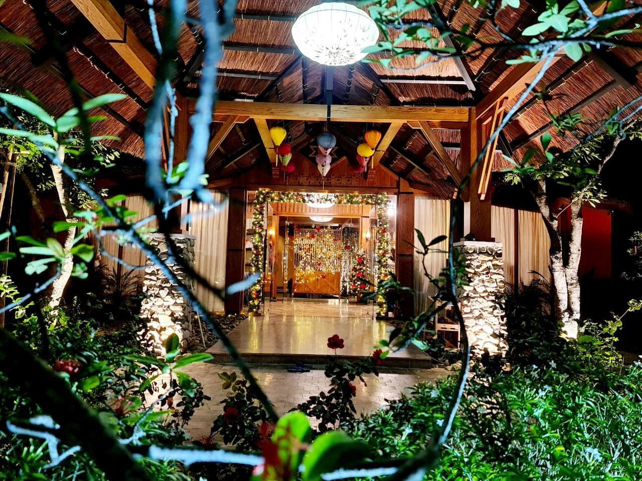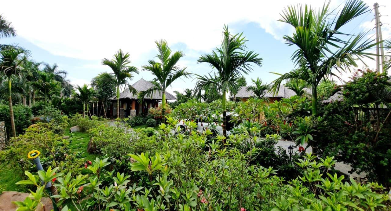 | Nhà chòi ngồi chơi cũng được lợp lá, bao quanh là các khóm hoa, cây cảnh. Đường đi trong khu nhà lát gạch. |