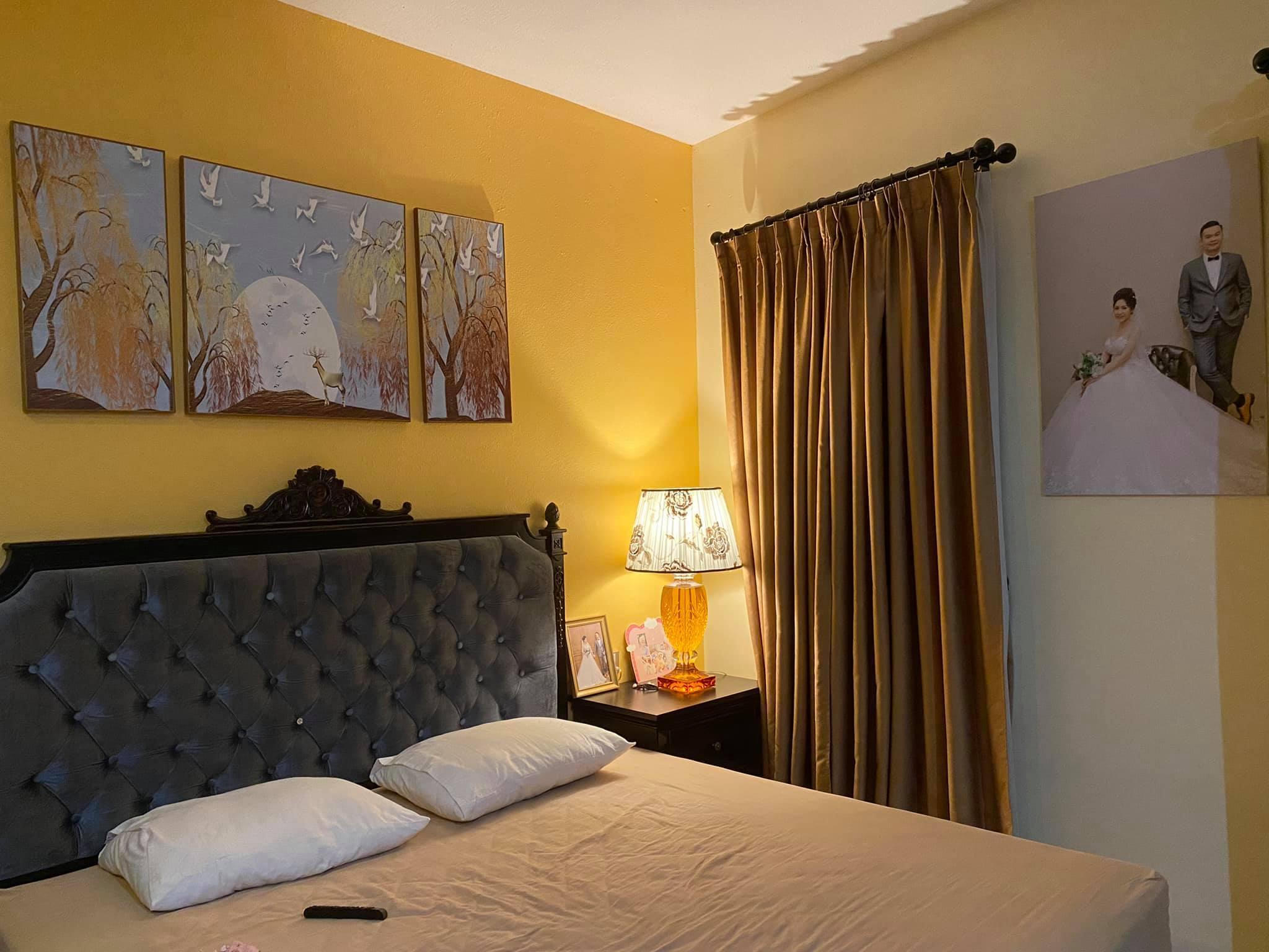 Phòng ngủ chính của hai vợ chồng, thiết kế hơi hướng cổ điển. Trong phòng có thêm bàn trang điểm và kệ bày túi xách.