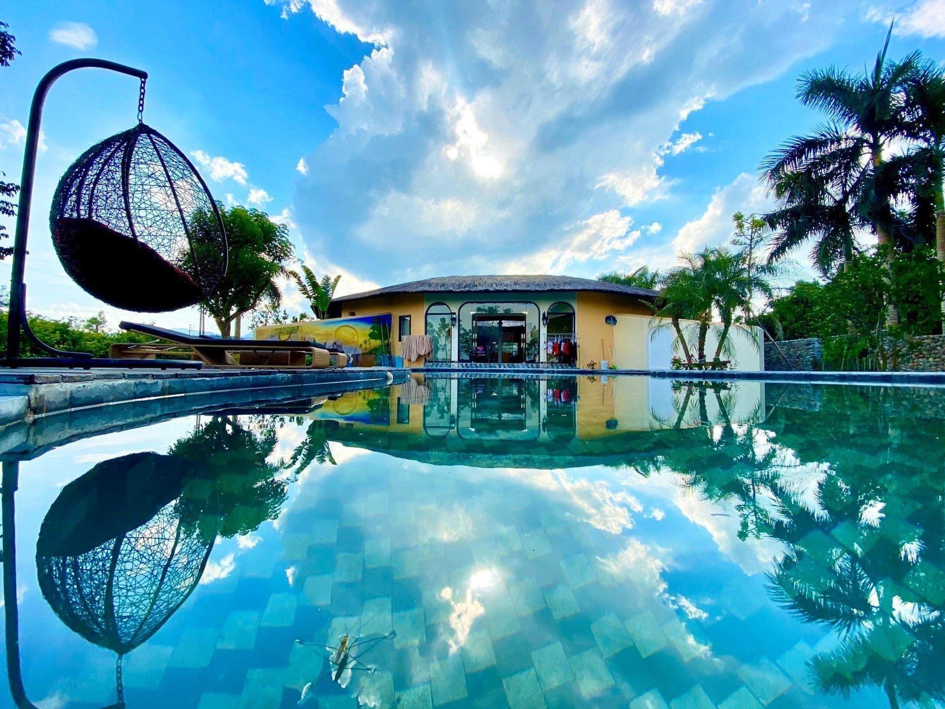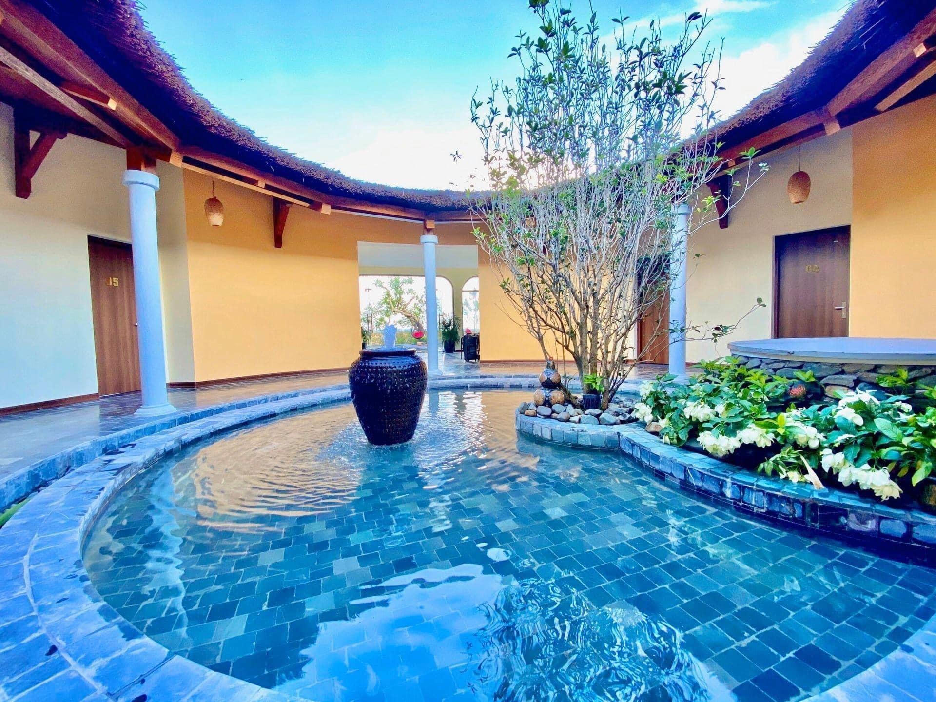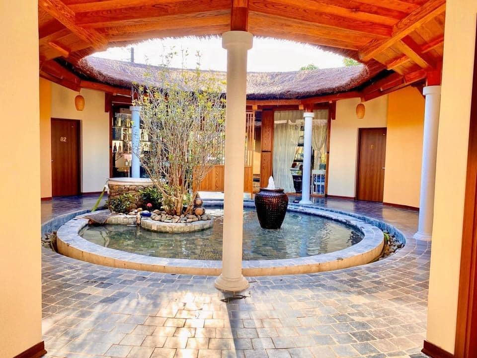 | Nhà xây theo hình tròn, lợp mái lá chống nóng. Phía trước là bể bơi. |