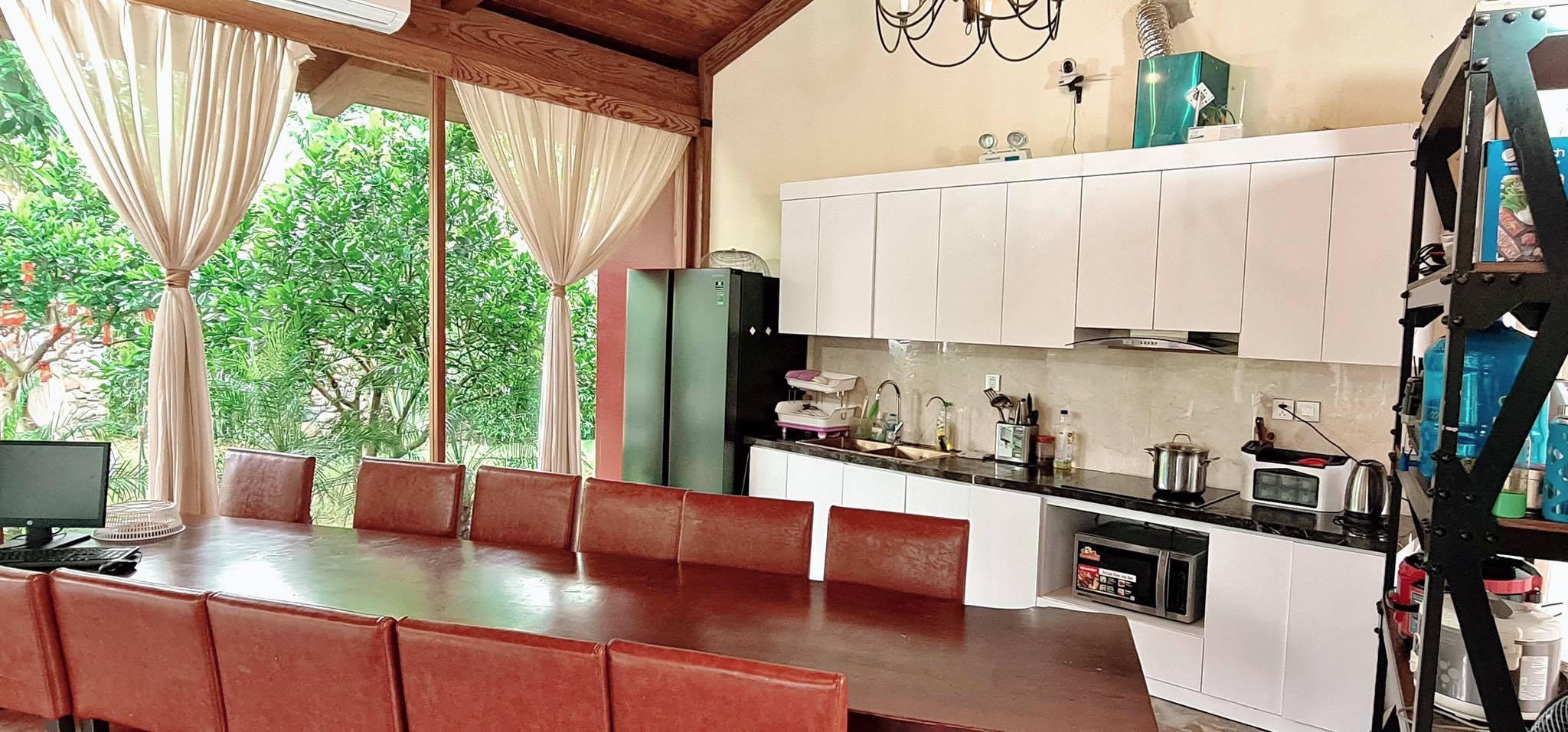 | Phòng bếp, ăn phục vụ được cho khoảng 12 người. Do gia đình ở đây cũng nhiều nên chị Thanh đầu tư nhiều thiết bị hiện đại, bao gồm cả lò nướng bánh. |