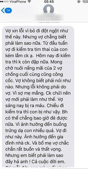 Nhưng chỉ khoảng 15 phút sau đó tôi nhận được tin nhắn của vợ thông báo mất con, mong được tha thứ, người chồng như ngã gục.