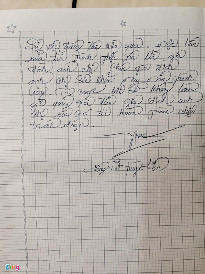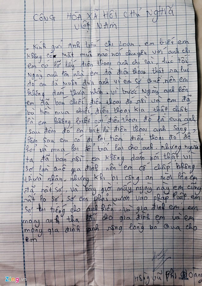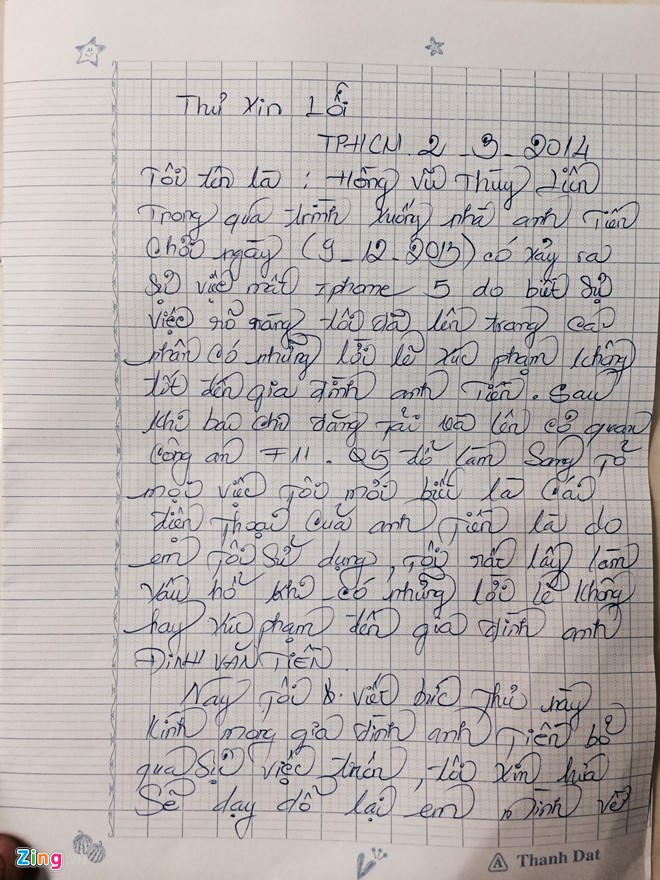 Trong thư, cô viết rõ mình xin lỗi gia đình anh Tiến vì đã có những lời lẽ xúc phạm không tốt, cũng như không biết cách dạy dỗ em trai, để xảy ra vụ mất cắp iPhone.