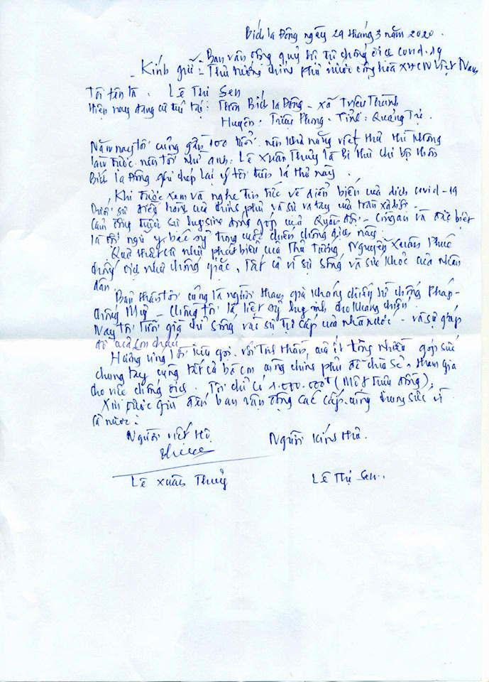 (PLVN) - Dù tuổi đã cao, gia cảnh còn vất vả nhưng khi nghe lời kêu gọi toàn dân chung tay phòng chống dịch Covid-19 của Thủ tướng, cụ bà Lê Thị Sen (trú tại thôn Bích La Đông, xã Triệu Thành, huyện Triệu Phong, tỉnh Quảng Trị) đã dành số tiền 1 triệu đồng tiết kiệm được gửi tới xã "xin ủng hộ" phòng chống dịch Covid-19 kèm lá thư viết tay nhờ người cháu ghi hộ đầy xúc động.