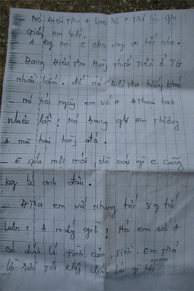 Một trong những bức thư tay chúng tôi thu thập được có nội dung: “Nó điều tra A (anh - PV) sao rồi? Trả lời ghi giấy cho em biết. Anh không nói e (em - PV) cho vay ai hết nhe (…) Để nó điều tra hướng khác. Nó hỏi ngày em với anh điện thoại bao nhiêu lần? Nó đang nghi em thương anh mà hại Hùng đó. Em quá mệt mỏi, dù có gì em cũng không bỏ anh đâu. Điều tra em tới 8 giờ tối luôn. Anh mấy giờ? Hỏi em với anh có dính líu tình cảm, tiền? Em trả lời rồi, tôi không dính líu gì hết…”.