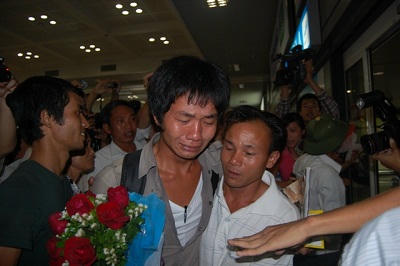 15h10, hệ thống phát thanh của sân bay Nội Bài thông báo chuyến bay ký hiệu QR614 của hãng hàng không Qatar đáp xuống sân bay. Những ông bố, bà mẹ đặt tay trước ngực, thấp thỏm nhìn về hướng lối ra của hành khách. Không khí yên lặng đến lạ kỳ, không hề có 1 tiếng động. Tất cả đều hồi hộp chờ đợi 12 thuyền viên bước ra. Phải gần 1 tiếng sau, 12 người con, người anh, người bố...mới hoàn tất thủ tục, để niềm vui vỡ òa.