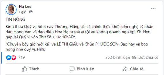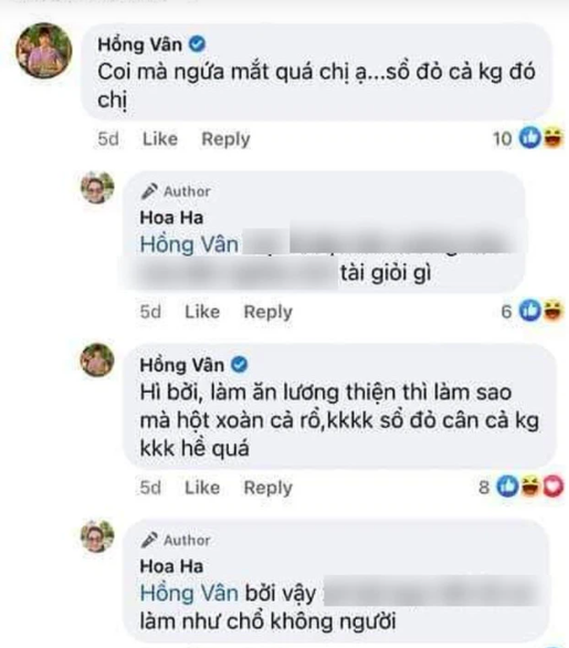 Tài khoản Facebook của NSND Hồng Vân và NSƯT Hoa Hạ mới trò chuyện qua lại. Dù không nêu tên trực tiếp song cộng đồng mạng cho rằng cả hai nói về bà Phương Hằng - nhân vật “gây chiến” với cả dàn nghệ sĩ Việt nhiều tuần qua. Trong đó, NSND Hồng Vân bình luận: "Coi mà ngứa mắt quá chị ạ. Sổ đỏ cả cân đó chị", "Làm ăn lương thiện thì làm sao mà hột xoàn cả rổ, sổ đỏ cân cả kg, hề quá".