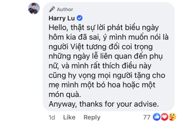 Khi được hỏi về kế hoạch trong Ngày của Mẹ, Harry Lu trả lời như sau: "Ở Việt Nam, về cơ bản, tôi cũng sẽ đưa mẹ đi ăn, sau đó tặng hoa. Nhập gia tuỳ tục, vì Việt Nam là đất nước theo chế độ mẫu hệ nên bất kỳ ngày lễ nào liên quan đến phụ nữ, mọi người đều coi trọng và tặng hoa".