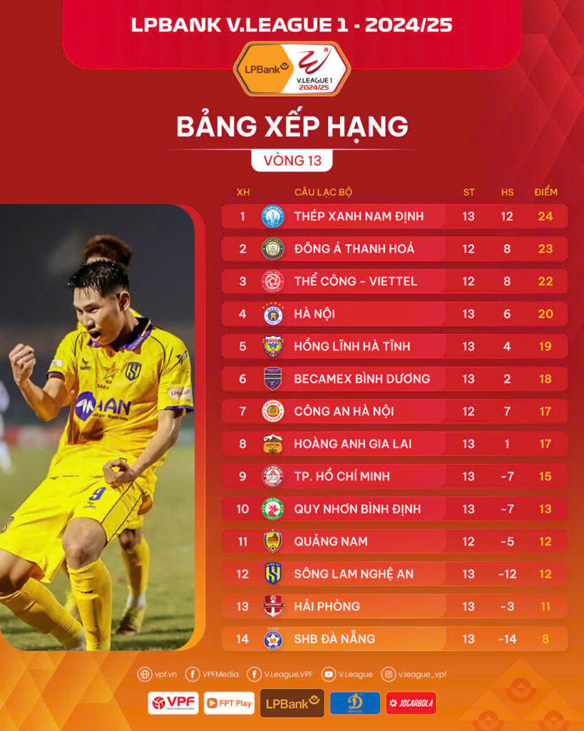 Trong khi đó, ở nửa dưới của bảng xếp hạng, Sông Lam Nghệ An đã tạm thời vượt qua chính Hải Phòng sau khi đánh bại đối thủ này để vươn lên vị trí thứ 12, nhưng cách biệt giữa Sông Lam Nghệ An với Hải Phòng chỉ là 1 điểm và mọi thứ vẫn còn bỏ ngỏ sau 13 trận của lượt về mùa bóng năm nay.