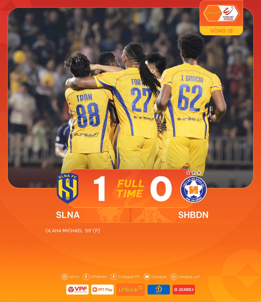 Và trong hiệp 2, đội khách Đà Nẵng lại là CLB mắc sai lầm như vậy, khi phạm lỗi trong vòng 16m50, tạo cơ hội cho tiền đạo Olaha đội chủ nhà Sông Lam Nghệ An ghi bàn thắng duy nhất trên chấm 11m (phút 59).