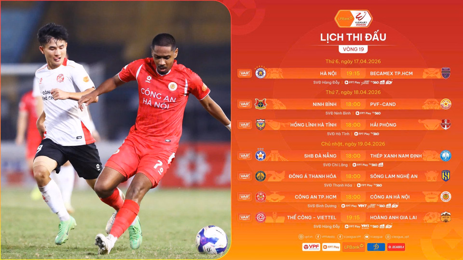 Cả 4 trận còn lại vòng 19 V.League 2025/26 đều được tổ chức vào hôm nay, 19/4. Trong đó, trận đấu thu hút sự chú ý nhiều nhất là derby giữa Công an TP HCM với Công an Hà Nội tại sân Bình Dương.
