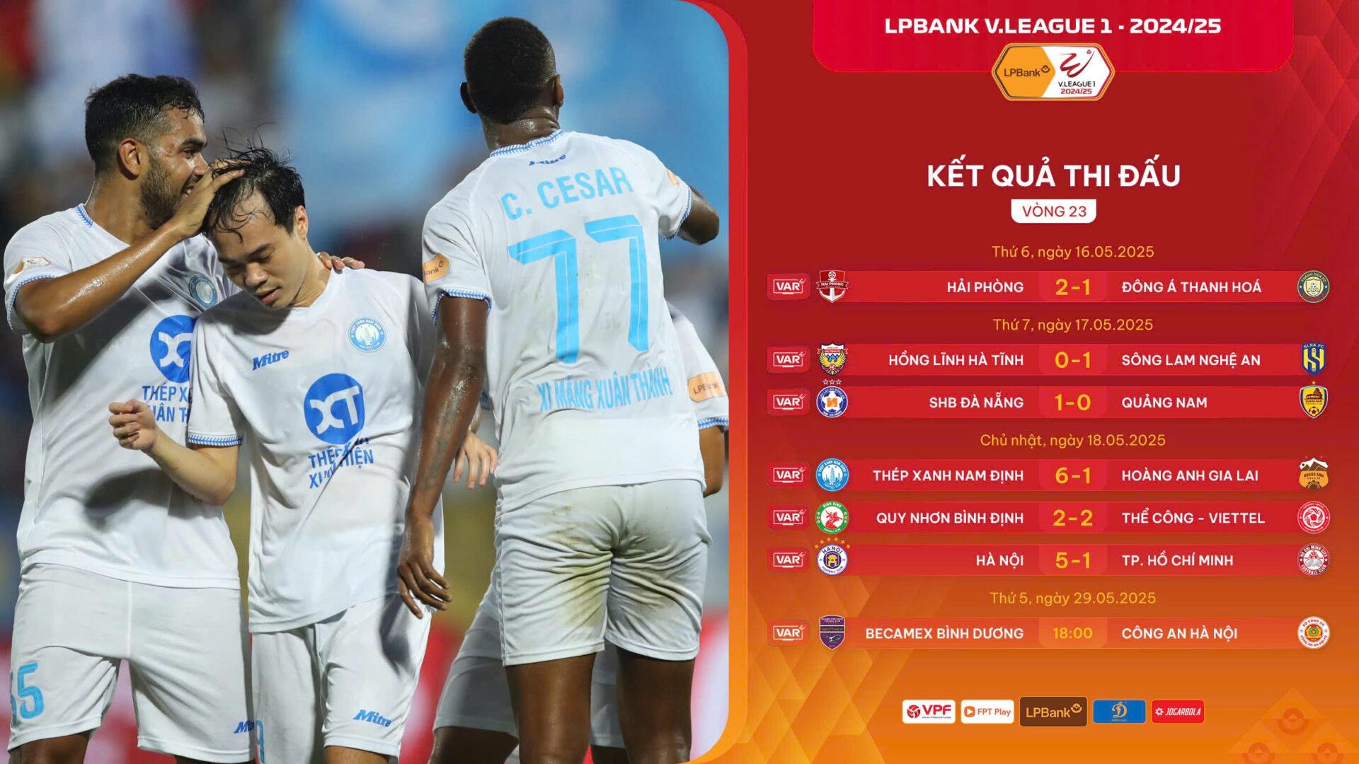 Kể từ sau trận hoà 0-0 với SHB Đà Nẵng ở vòng 19, Thép Xanh Nam Định đã toàn thắng trong 4 vòng đấu liên tiếp vừa qua, ghi được tới 14 bàn thắng và chỉ để thủng lưới 3 bàn, củng cố vững chắc ngôi vị số một trên bảng xếp hạng.