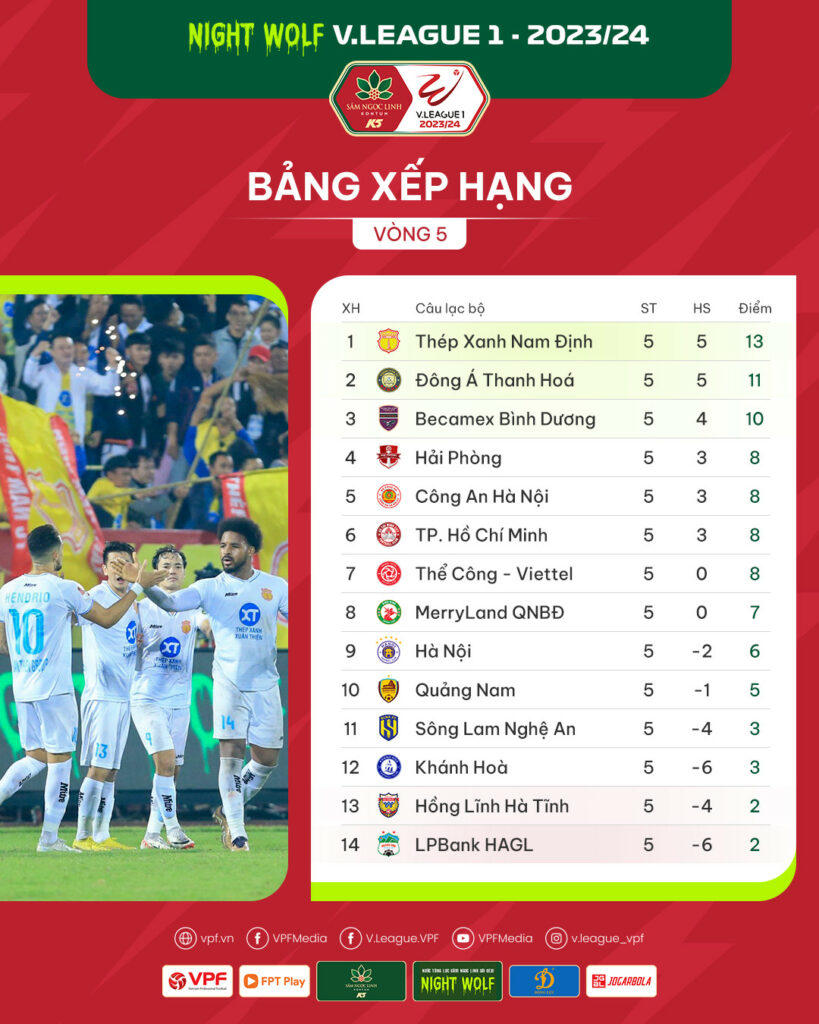 Việc chủ nhà Thép Xanh Nam Định không có được chiến thắng ở vòng 5 Night Wolf V.League 1 2023/24 đã khiến nhóm đầu bảng xếp hạng có sự thay đổi đột biến, khi Đông Á Thanh Hoá và Becamex Bình Dương tận dụng cơ hội này để vươn lên thu ngắn cách biệt với đội đầu bảng.