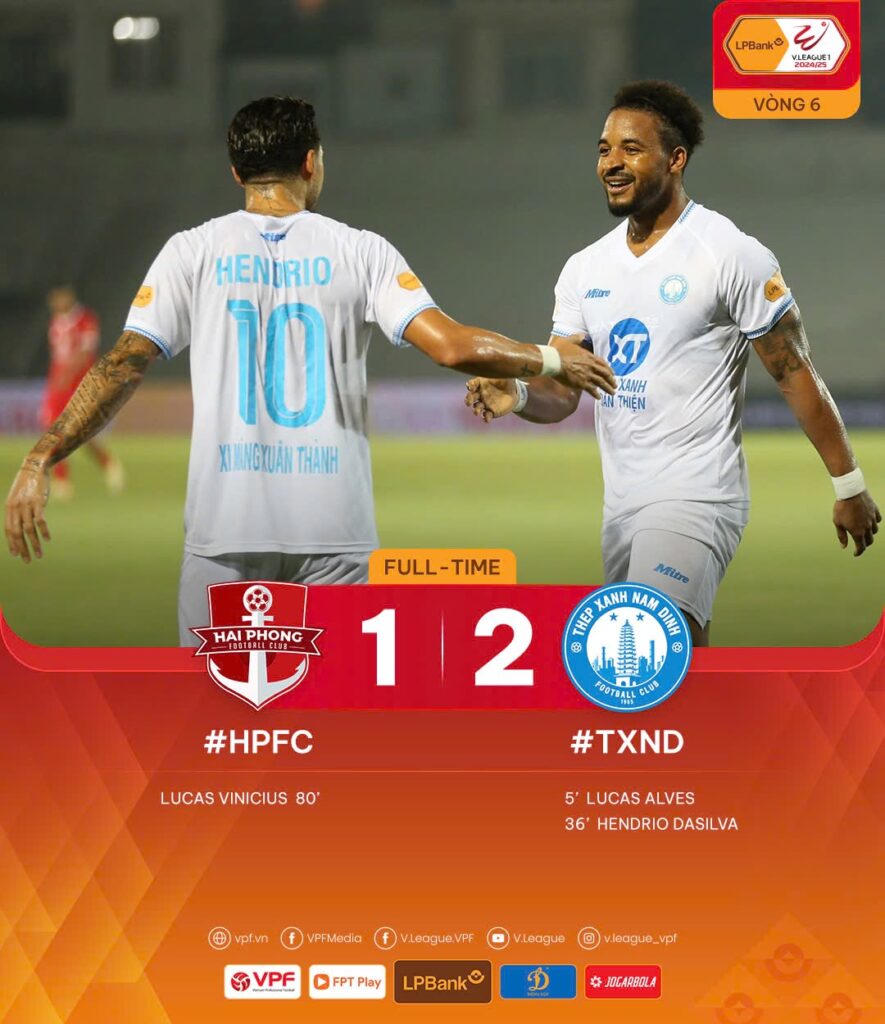 Không chỉ vậy, đội chủ nhà còn nhận thêm bàn thua thứ 2 từ pha tấn công sắc sảo bên cánh trái của Nam Định khi Văn Vĩ tạt bóng chính xác để Hendrio nâng tỉ số lên 2-0 phút 37. Bước sang hiệp 2, cả hai đội bóng đều thi đấu tấn công và tạo ra nhiều tình huống uy hiếp khung thành của nhau. Phút 80, Lucas ghi bàn rút ngắn cách biệt 1-2, mở ra tia hy vọng cho đội bóng đất Cảng. Tuy nhiên mọi nỗ lực của CLB Hải Phòng không thể chuyển thành bàn thắng và chấp nhận trận thua 1-2.
