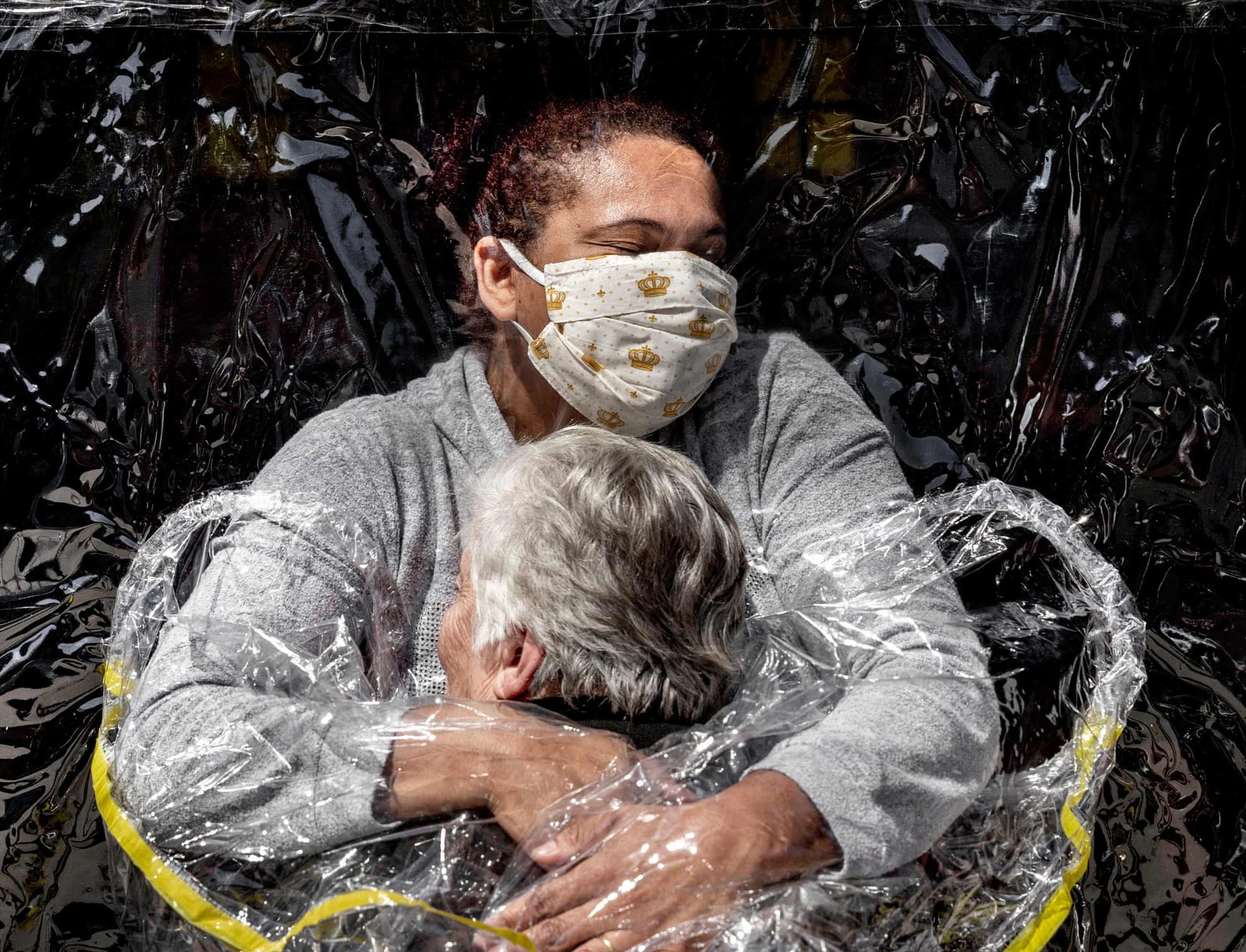 Với những ai chưa biết, hình ảnh cái ôm xa lạ còn tuyệt đẹp đến mức đã từng được trao Giải Ảnh Báo chí thế giới năm 2021. Bức ảnh thuộc về tác giả Mads Nissen, người Brazil, anh đã chụp trong một viện dưỡng lão, khi đại dịch COVID-19 đang bùng nổ mạnh mẽ, người già cô đơn hơn bao giờ hết vì con cháu không ai đến thăm họ, xung quanh chỉ còn bệnh tật và tuổi già bủa vây. Các y, bác sĩ trong viện dưỡng lão đã tổ chức chương trình nhỏ trong khuôn viên của viện, đó là các tấm “rèm ôm” - những cái ôm thông qua rèm nhựa trong suốt. Bức ảnh ghi lại khoảnh khắc cụ bà Rosa Luzia Lunardi (85 tuổi) đang trong vòng tay của y tá Adriana Silva da Costa Souza tại viện dưỡng lão Viva Bem, TP São Paulo, Brazil. Đây là cái ôm đầu tiên cụ Rosa nhận được trong vòng năm tháng, không phải từ con cháu hay bạn bè, người thân mà từ một y tá làm việc trong nơi cụ sống.