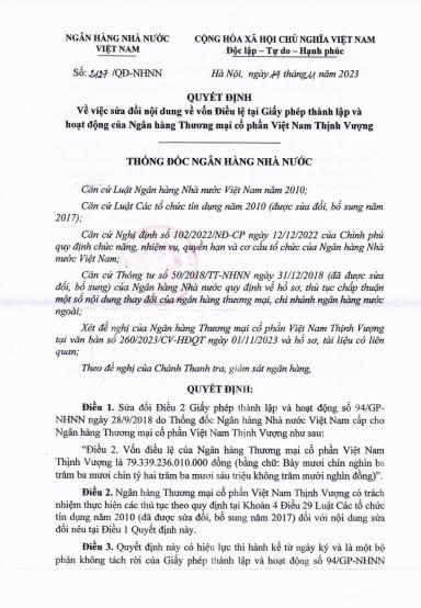 (PLVN) - Thống đốc Ngân hàng Nhà nước Việt Nam (NHNN) vừa ban hành Quyết định số 2127/QĐ-NHNN về việc sửa đổi nội dung về vốn Điều lệ tại Giấy phép thành lập và hoạt động của Ngân hàng thương mại cổ phần Việt Nam Thịnh Vượng (VPBank).