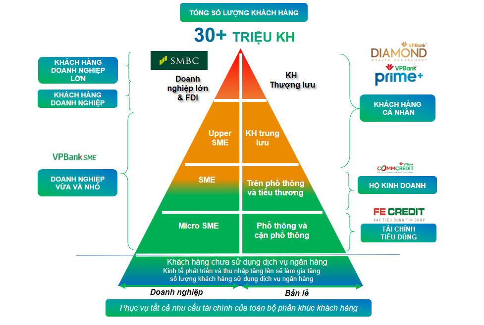 VPBank là ngân hàng duy nhất phục vụ tất cả các phân khúc khách hàng từ nhóm khách hàng phổ thông/cận phổ thông thông qua FE Credit đến nhóm khách hàng cá nhân, hộ kinh doanh, SME đến doanh nghiệp lớn. VPBank đã thiết kế ra các phân khúc chuyên biệt được “may đo” theo chân dung khách hàng, qua đó mang đến cho khách hàng những trải nghiệm dịch vụ tốt nhất.