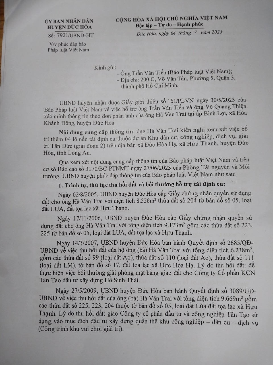 Ngày 4/7/2023, UBND huyện Đức Hòa đã có Văn bản 7921/UBND-HT do ông Lê Thành Phong, quyền Chủ tịch huyện ký, phúc đáp.