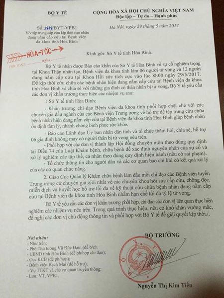 Công văn của Bộ trưởng Bộ y tế nêu rõ: Bộ Y tế nhận được báo cáo khẩn của Sở y tế Hòa Binh về sự cố nghiêm trọng tại Khoa Thận nhân tạo, Bệnh viên Đa khoa tỉnh làm 06 người tử vong và 12 người đang nằm cấp cứu. Để kịp thời cứu chữa các bệnh nhân hiện đang nằm cấp cứu tại Bệnh viện đa khoa tỉnh Hòa Bình và chia sẻ với những gia đình có thân nhân bị Tử vong, Bộ Y tế yêu cầu các đơn vị khẩn trương thực hiện các nhiệm vụ theo chức năng của mình.