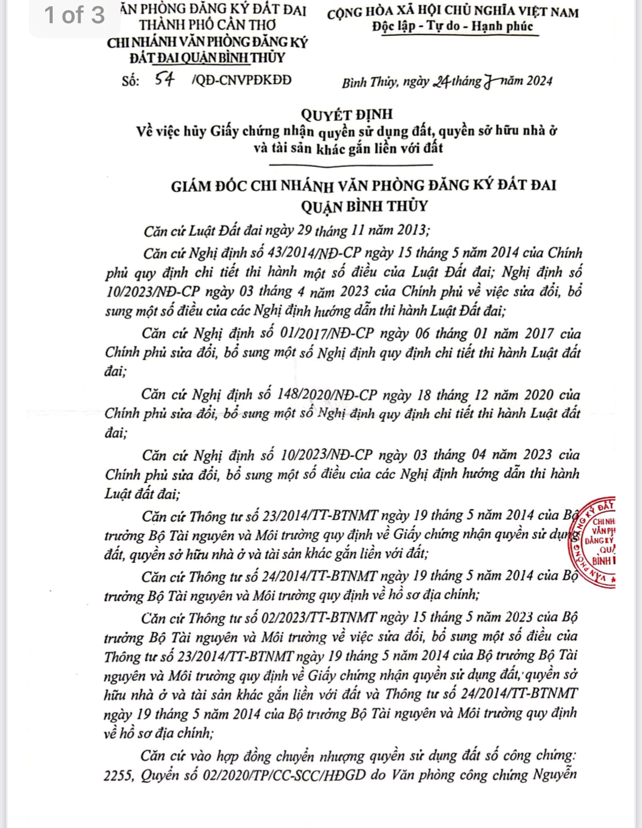 Tuy nhiên mới đây, ngày 24/7/2024, VPĐKĐĐ quận Bình Thủy đã ra Quyết định 54/QĐ-CNVPĐKĐĐ hủy 4 sổ đỏ ông Hòa đang giữ. Quyết định không nhắc đến các văn bản giải thích Bản án số 379 của TAND Cần Thơ, cũng không nhắc đến Bản án 44, mà quyết định hủy 4 sổ đỏ ông Hòa đang giữ vì lý do “người bị THA là ông Vũ Trung Hòa không giao, trả giấy chứng nhận để thực hiện bản án (Bản án 379 - NV)”.