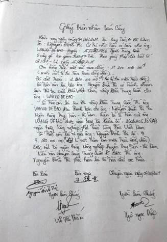 Việc mua bán này, hai bên đã làm “Giấy biên nhận bán cây” với nội dung: “…Tôi là Nguyễn Đình Thi có bán cho ông Wang De Bao người Trung Quốc 5 cây gỗ bao gồm Hương + Trắc theo Giấy phép đặc biệt số 08/GP-KL ngày 15/9/2011, với giá 11,2 tỷ đồng. Ông Bao đặt trước 2,02 tỷ đồng, số tiền còn lại ông Thi có trách nhiệm làm thủ tục xuất khẩu Việt Nam, nhập khẩu Trung Quốc cho ông Wang De Bao. Sau khi nhập khẩu sang Trung Quốc, ông Bao phải thanh toán cho ông Thi nốt số tiền còn lại (9,1 tỷ đồng)…”, có xác nhận bên mua, bên bán và 02 người làm chứng là Vũ Thị Thắm và Ngô Ngọc Diệp. Ông Thi cho biết: “Giấy biên nhận này do bà Ngọc Diệp soạn thảo. Thực tế ông Bao mua 5 cây gỗ Hương + Trắc và 01 cây Sưa, tổng cộng là 6 cây. Trong Giấy biên nhận không hề viết là có cây Sưa”.