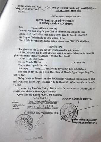 Ngày 17/1/2012, Cơ quan CSĐT Hà Nam tiếp tục ra Quyết định thu giữ số tiền 9,18 tỷ đồng và toàn bộ số tiền lãi phát sinh tại Ngân hàng Nông nghiệp & PTNT huyện Duy Tiên - mang tên Nguyễn Thị Huệ. Ngày 23/3/2012, Cơ quan CSĐT Công an tỉnh Hà Nam ra quyết định trả lại số tiền 9,3 tỷ đồng cho ông Bao.