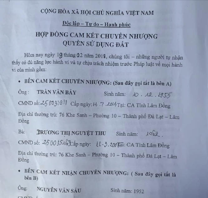 Hợp đồng “cam kết chuyển nhượng quyền SDĐ” giữa hai bên. |