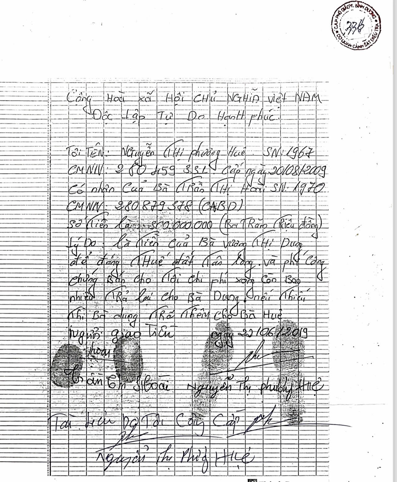 Tuy nhiên, theo bà Huệ, vào ngày 18/6, do gia đình bên bán đất có việc bận, không thể thực hiện trích lục hồ sơ, ký hợp đồng mua bán nên bà Dung nhờ anh Trần Thanh Tài (con trai bà Huệ) đứng đại diện ủy quyền thay bà để thực hiện trích lục bản đồ, xác nhận bất động sản và ký hợp đồng mua bán. Bà Dung đưa cho anh Tài 1 triệu đồng là chi phí thực hiện trích lục hồ sơ.