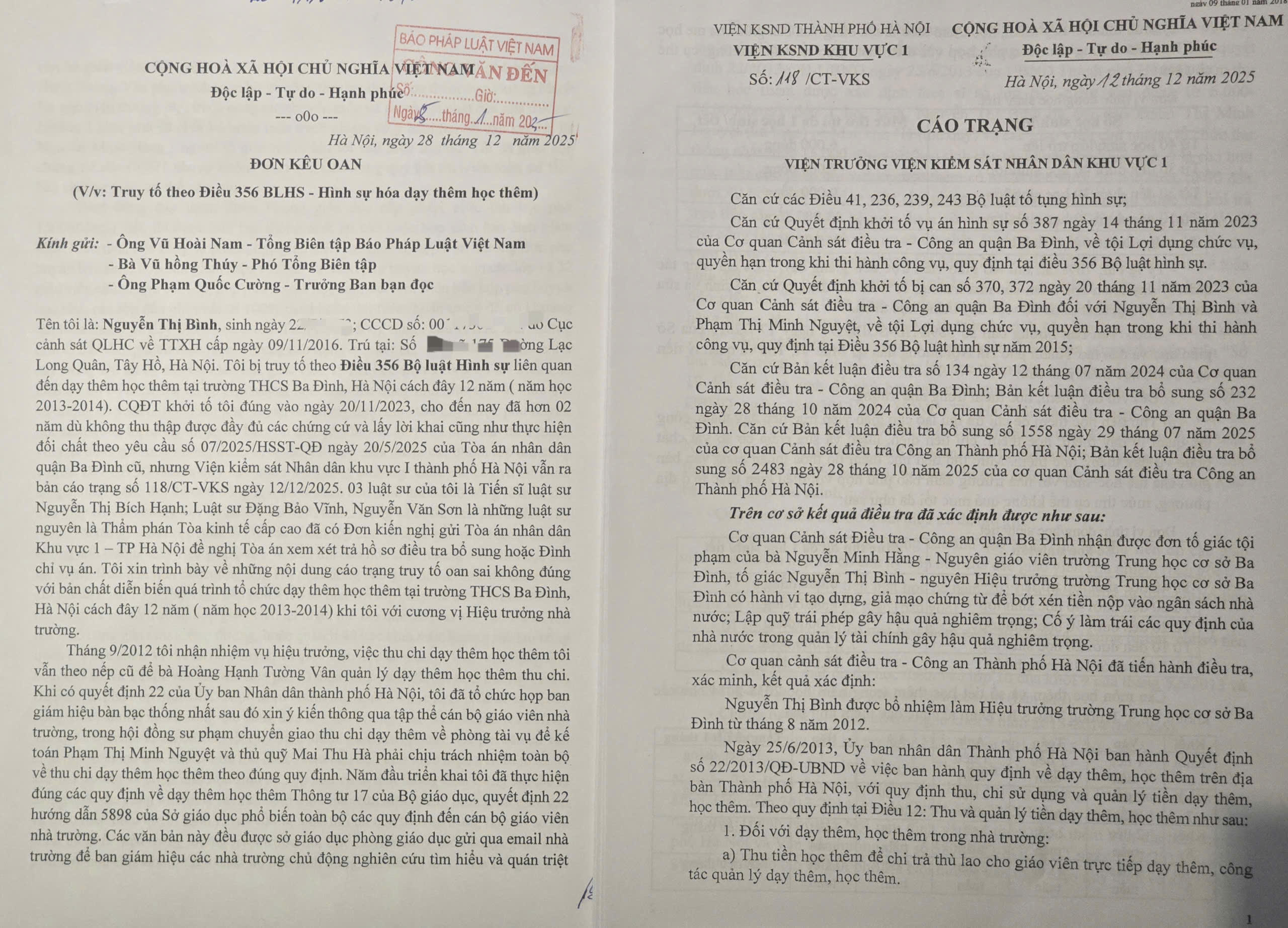 Theo Cáo trạng 257/CT-VKS ngày 9/11/2024 của VKSND quận Ba Đình (cũ), trong năm học 2013 - 2014, thực hiện tổ chức dạy thêm, học thêm (DTHT) trong nhà trường theo Quyết định (QĐ) 22/2013/QĐ/UBND ngày 25/6/2013 của UBND TP, bà Bình có hành vi lợi dụng chức vụ, quyền hạn là hiệu trưởng, chỉ đạo kế toán Phạm Thị Minh Nguyệt và các giáo viên chủ nhiệm các khối lớp 7, 8, 9 thu tiền DTHT theo một mức chung với số tiền 15.000 đồng/1 tiết/1 học sinh (HS), cao hơn mức tối đa quy định trong QĐ 22 (kèm theo Văn bản hướng dẫn 5898/HD-SGD&ĐT này 17/7/2013 của Sở GD&ĐT - HD 5898).