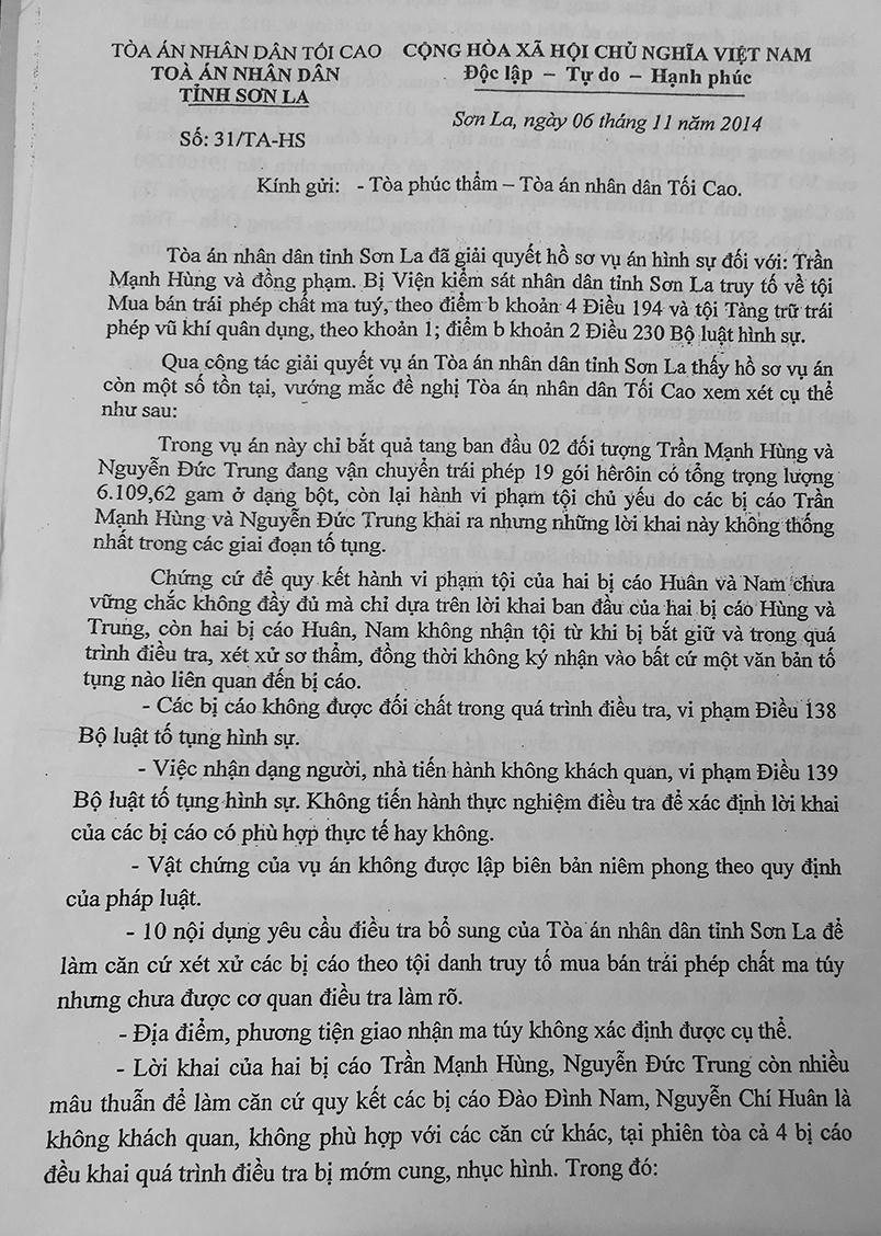 Sau đó, TAND tỉnh Sơn La thụ lý vụ án. Nguyên Thẩm phán – Chủ tọa phiên tòa sơ thẩm lần đầu là ông Nguyễn Văn Hải lúc đó đã nhận thấy hồ sơ vụ án còn thiếu nhiều chứng cứ nên đã yêu cầu trả hồ sơ để điều tra bổ sung 10 nội dung nhưng Cơ quan CSĐT Công an tỉnh Sơn La chưa làm rõ như: Xác minh rõ đối tượng Páo (Sáng) bán ma túy cho Phương, Hùng, và Trung.