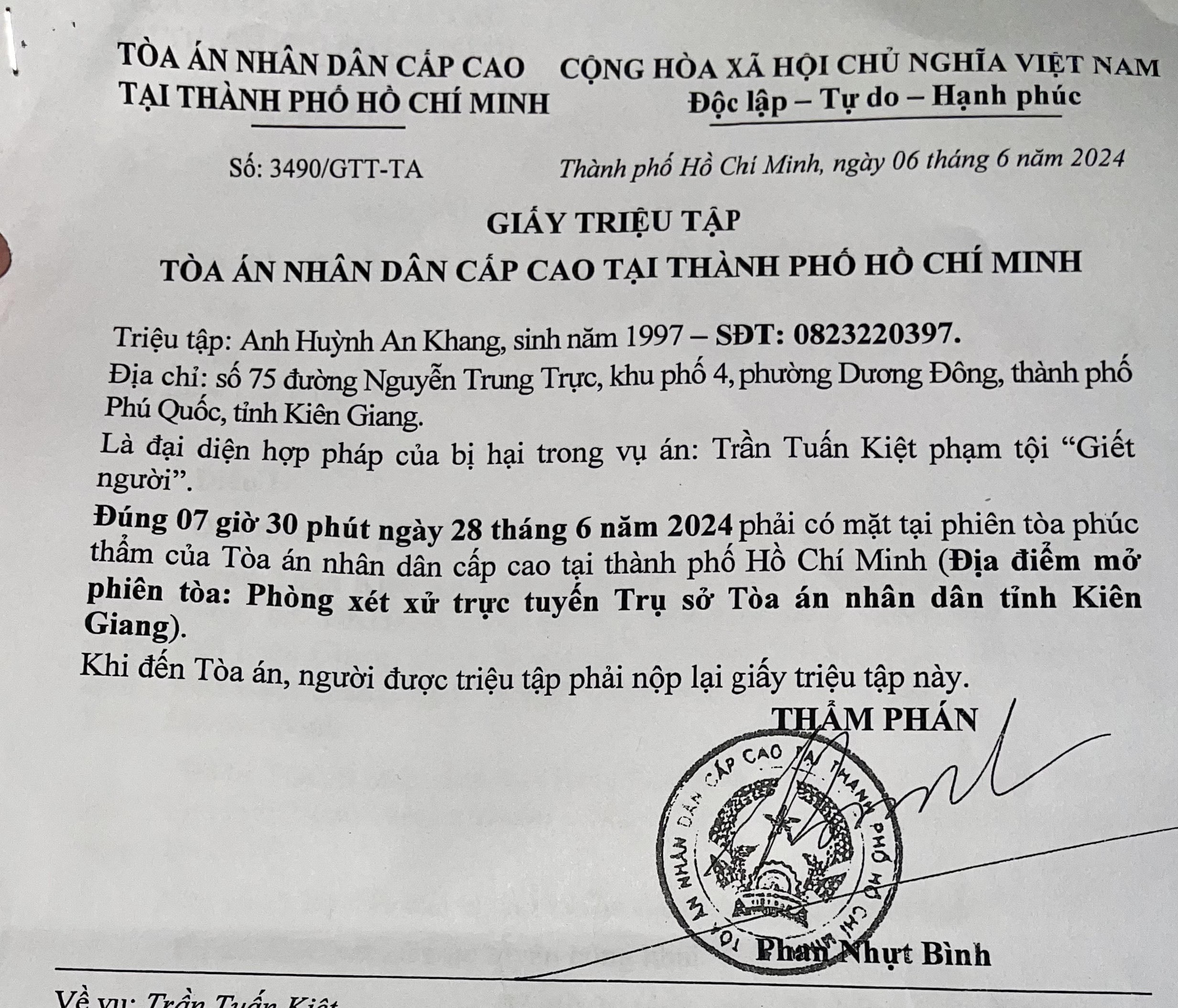 (PLVN) - Dự kiến ngày 28/6 tới đây, TAND cấp cao tại TP HCM sẽ mở phiên phúc thẩm vụ “Giết người” vì bị nhắc nhở đi tiểu bậy với bị cáo Trần Tuấn Kiệt (SN 1992, ngụ Phú Quốc, Kiên Giang). Nạn nhân là ông Huỳnh Văn Phồn (đã chết).
