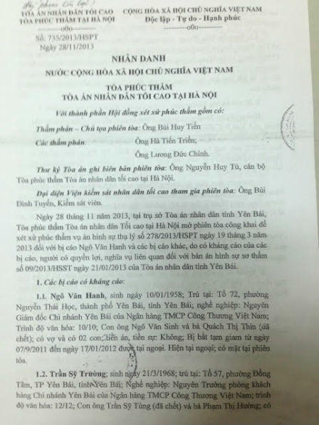 Vụ án nguyên giám đốc Ngân hàng Thương mại CP Công thương Việt Nam – Chi nhánh Yên Bái cùng các nhân viên dưới quyền vi phạm quy định cho vay trong hoạt động tín dụng gây thất thoát hàng chục tỷ đồng gây chấn động tỉnh miền núi nghèo Yên Bái nhưng quá trình điều tra, xét xử ở cấp sơ thẩm đã bị Tòa phúc thẩm – TAND tối cao nhận định “điều tra không đầy đủ mà cấp phúc thẩm không thể bổ sung được” và hàng loạt sai sót trong thủ tục tố tụng nghiêm trọng cũng đã được chỉ ra. Điều này dẫn tới, Tòa phúc thẩm đã buộc phải tuyên hủy án để điều tra lại từ đầu.