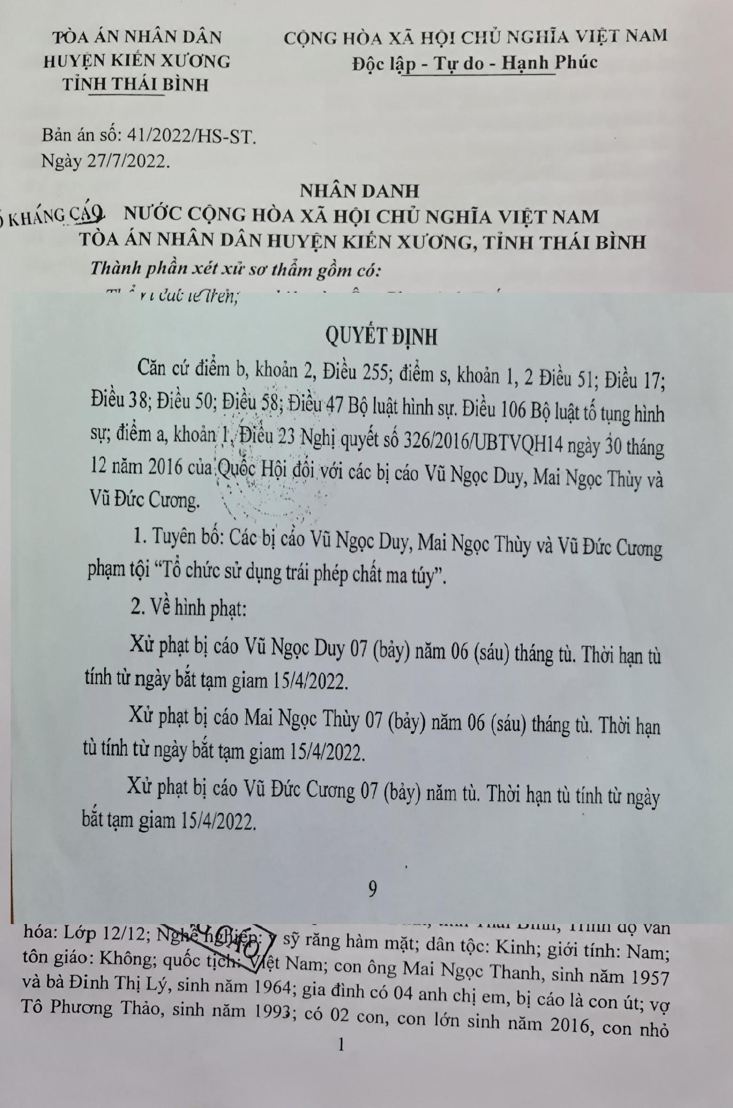Bản án sơ thẩm của Tòa án nhân huyện Kiến Xương tuyên phạt các bị cáo: Vũ Ngọc Duy 7 năm 6 tháng tù, Vũ Đức Cương 7 năm tù, Mai Ngọc Thùy 7 năm 6 tháng tù. |