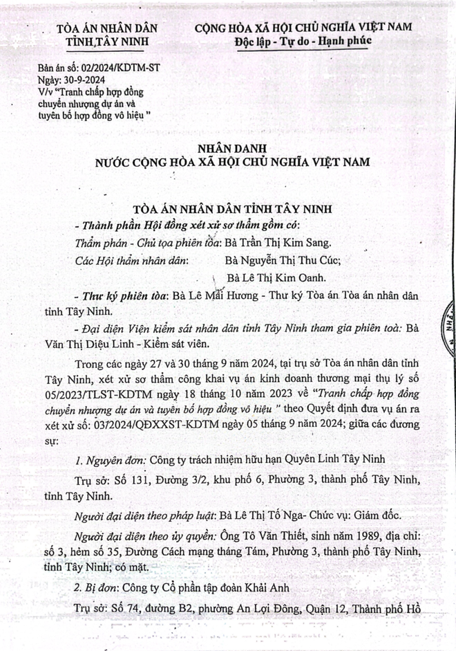 Theo hồ sơ, ngày 20/2/2020, Cty TNHH Quyên Linh Tây Ninh và Cty Cổ phần Tập đoàn Khải Anh ký bản ghi nhớ về chuyển nhượng dự án là trại heo theo công nghệ khép kín tại ấp Hòa Bình, xã Hòa Hiệp, huyện Tân Biên (cũ), tỉnh Tây Ninh (nay sáp nhập vào tỉnh Long An). Theo thỏa thuận trong 12 tháng, Cty Khải Anh phải trả tiền và thay mặt Cty Quyên Linh trả tiền gốc và lãi cho ngân hàng; Cty Quyên Linh chịu trách nhiệm hoàn thiện các thủ tục pháp lý đủ điều kiện chuyển giao dự án.