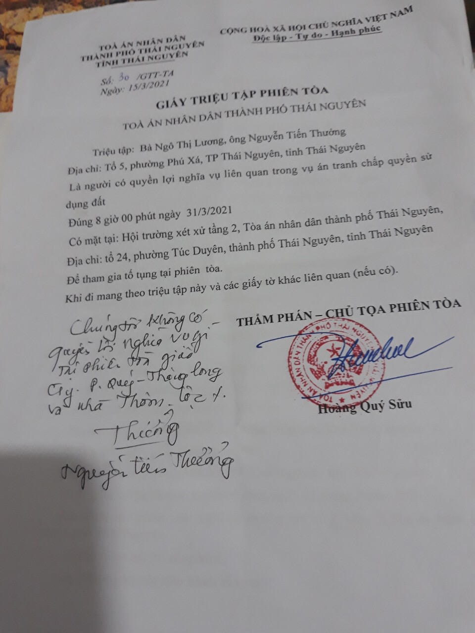 Mặc dù, chứng cứ giải quyết vụ án được nguyên đơn và cơ quan có thẩm quyền của tỉnh Thái Nguyên cung cấp đầy đủ, rõ ràng, ấy vậy TAND TP Thái Nguyên vẫn cho là chưa đủ. Đồng thời, Thẩm phán TAND TP Thái Nguyên Hoàng Quý Sửu ký một thông báo về việc thụ lý bổ sung vụ án mà đương sự thấy thật sư không bình thường.