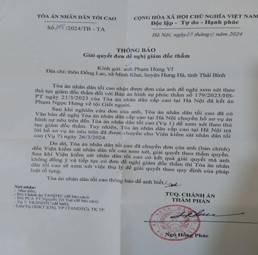 Liên quan đến vụ án, sau nhiều lần gửi đơn kiến nghị đến các cơ quan tố tụng, mới đây, ông Phạm Hùng Vĩ (đại diện bị cáo Phạm Ngọc Hưng) đã nhận được Thông báo 278/2024/TB-TA “Giải quyết đơn đề nghị giám đốc thẩm” của TAND tối cao. Theo đó, TAND tối cao đã có văn bản đề nghị TAND cấp cao tại Hà Nội chuyển hồ sơ vụ án hình sự trên đến TAND tối cao (Vụ 1) để xem xét theo thủ tục giám đốc thẩm.