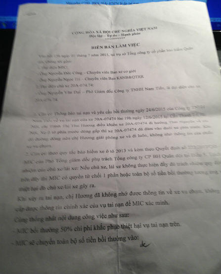 Trong cuộc làm việc này, đại diện của MIC giải thích những thắc mắc của đại diện chủ xe gặp nạn về cách giải quyết bồi thường của MIC trong từng trường hợp khác nhau đối với Cty Nam Tiến. Đại diện phía Cty Nam Tiến khẳng định vụ tai nạn là có thực. Tại cuộc làm việc này, đại diện MIC xác nhận tổn thất của xe là có thật.