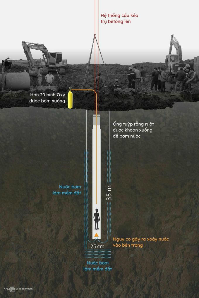 Phương án khoan, bơm nước và dùng hệ thống cẩu kéo trụ bêtông lên. Đồ hoạ: Khánh Hoàng