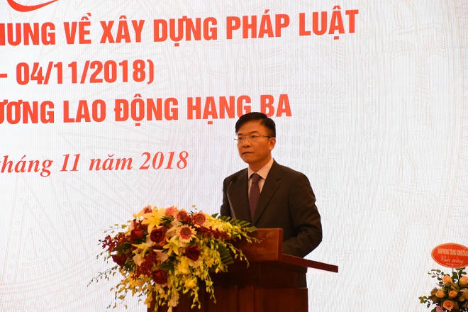 (PLO) - Chiều 2/11, Bộ Tư pháp tổ chức Lễ kỷ niệm 10 năm thành lập Vụ Các vấn đề chung về xây dựng pháp luật (CVĐCVXDPL) (4/11/2008 – 4/11/2018) và đón nhận Huân chương Lao động hạng Ba.
